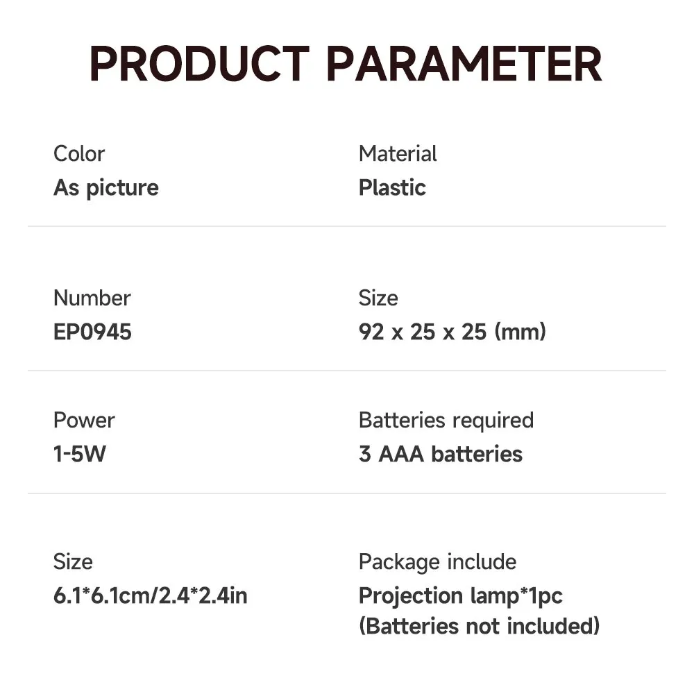 Package Includes – 1 Projection Lamp in Plastic Packaging (Batteries not included)